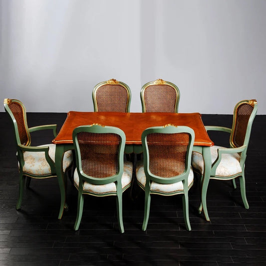 Dynasty American Style Rattan & Leather Dining Table Set - Post-Modern Antique Design