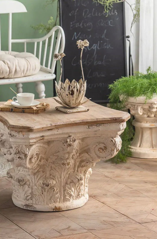 Classic Retro Nesting Tea Table - Carved Iron & Fir Wood Farmhouse Accent Table