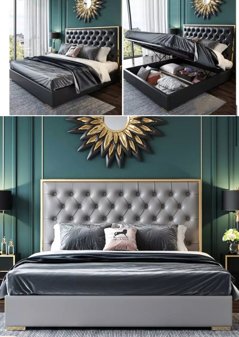 Transforma tu dormitorio con la cama King Size de lujo . Con diseños extensibles, capitoné y adornos con forma de clavo, esta moderna cama está tapizada con cuero regenerado y fabricada con resistente acero inoxidable en Alemania. La construcción refrescante, de madera contrachapada y de esponja garantiza un descanso confortable todas las noches. Los muebles de dormitorio modernos tapizados con estructura King Size vienen con una garantía de 3 años y entrega en 10 a 15 días.