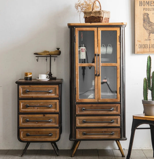 Rustic Solid Wood Retro Metal Cabinet Vintage 2 Glass Door Storage Accent Cabinet
