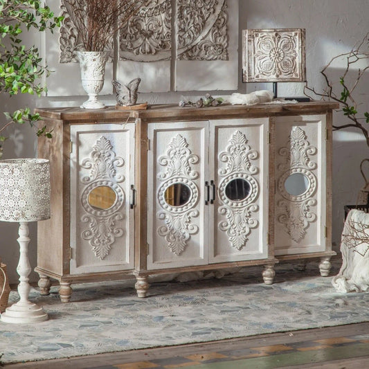 Retro Farmhouse Shabby Chic Console Table - Carved Wood Accent Cabinet