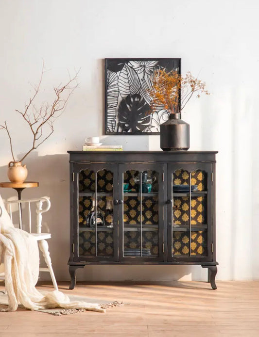Retro Design Living Room Console Furniture Black Wood Glass Doors Sideboard Buffet Accent Cabinet